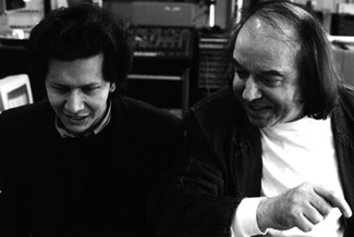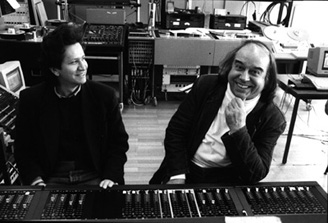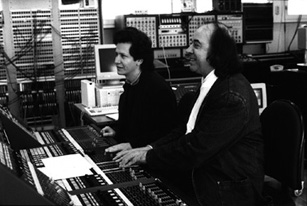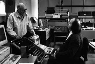 Working on the large prototype-console at the studio of the WDR with Daniel Velasco-Schwarzenberger (sound engineer and realisation assistant) Travail sur la grande console-prototype du studio du WDR avec Daniel Velasco-Schwarzenberger (ingénieur du son et assistant de réalisation) |