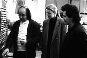 At the general connections board, with Gertrud Melcher (sound technician) and Daniel Velasco-Schwarzenberger. Au panneau général de connexions, avec Gertrud Melcher (technicienne du son) et Daniel Velasco-Schwarzenberger. |